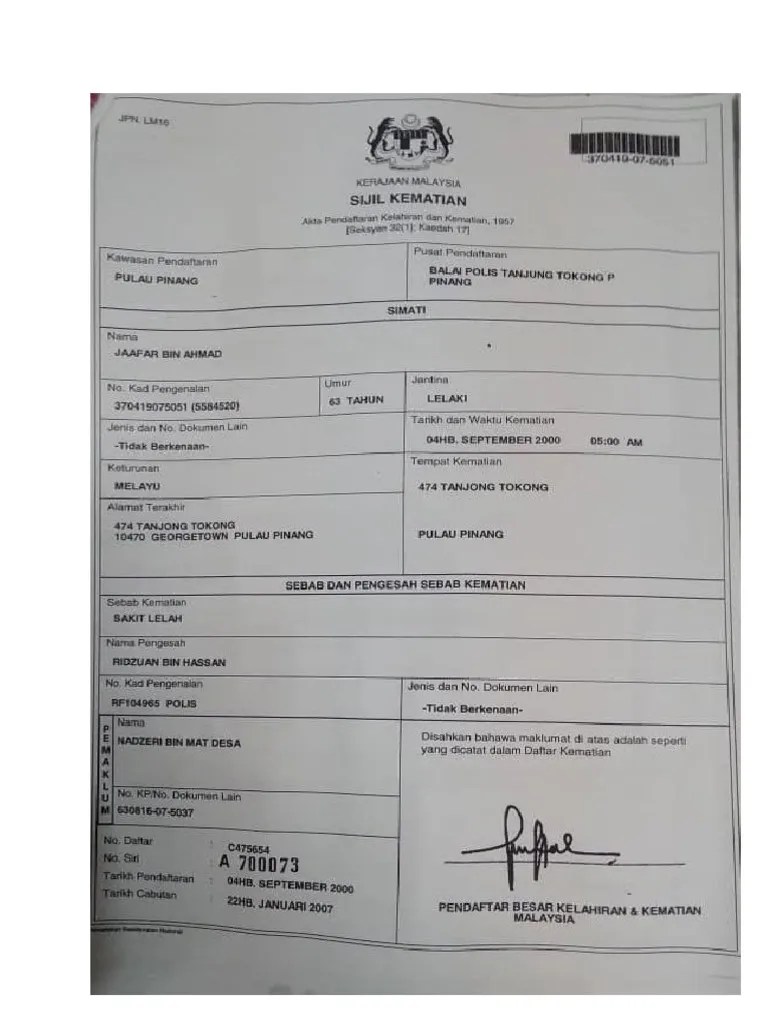 Ibu atau bapa si mati ;; Pemaklum atau waris si mati boleh mengambil sijil kematian di pejabat jpn yang telah ditetapkan. Cara daftar kematian di jabatan pendaftaran negara jpn wawa nasir. Sijil kematian ialah suatu dokumen perakuan maklumat mengenai kematian. Tak nak pening la, sebagai anak kepada simati korang perlu bawa kad pengenalan ic dan salinan sijil kematian je. Anak kandung atau anak angkat yang . Akta pendaftaran kelahiran dan kematian,1957 seksyen 31 dan .